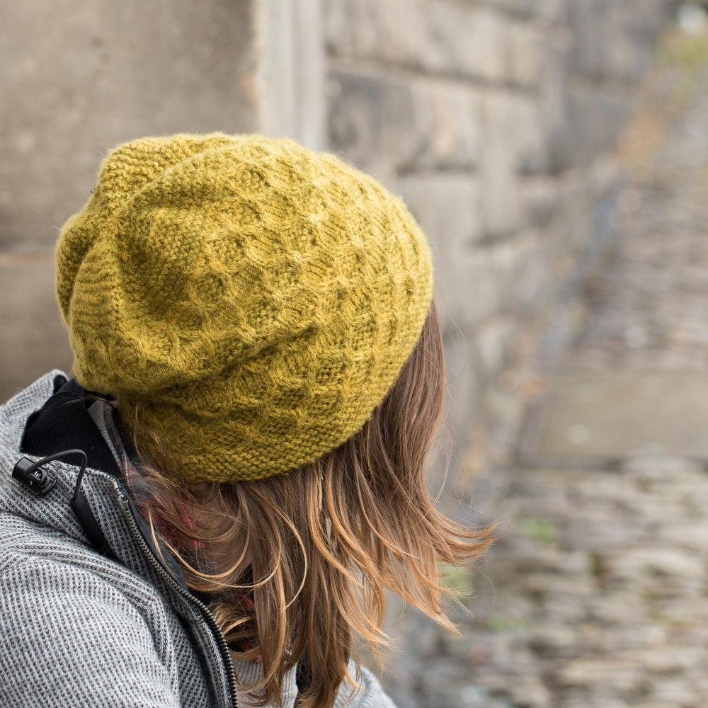 Cables and slipped stitches create a three dimensional pattern with shadowed areas that make it look much more complicated than it really is. The vast majority of rounds are simply knit or purl, perfect for last minute gifts or movie watching. The hat is worked in the round from the bottom up and given in four sizes to fit children and adults.