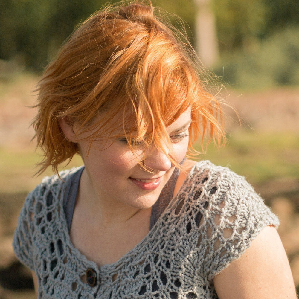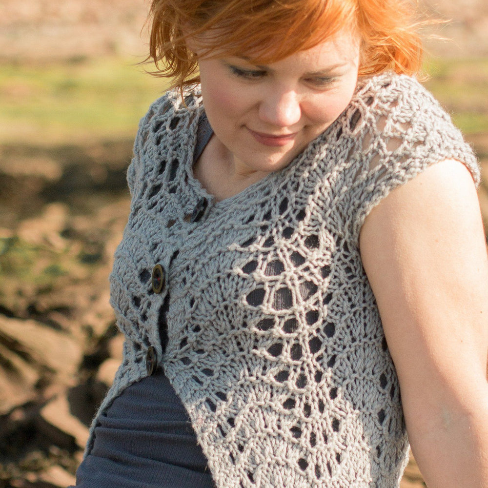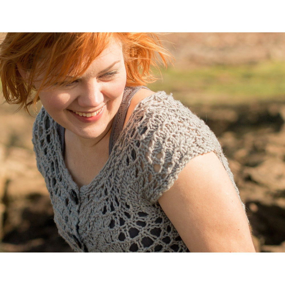 Liesl is a round yoked cardigan worked from the neck down in a simple allover feather and fan lace pattern.
