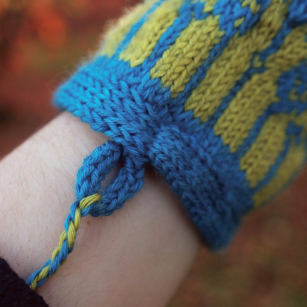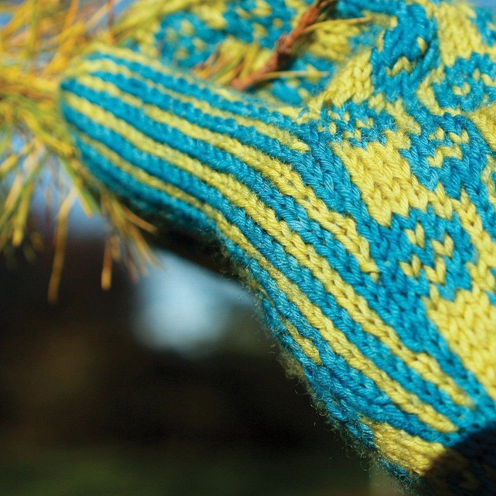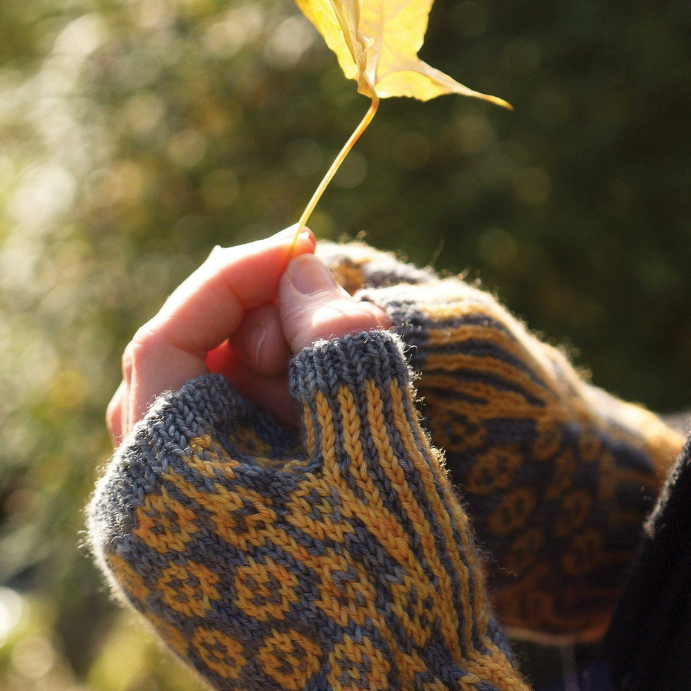They combine traditional stranded colourwork techniques and shaping, with a simple and modern geometric pattern. The cuffs begin with an I-cord edging that creates little loops for hanging or for attaching an optional string, because even grown ups can lose their mittens and you put too much work into these for that! Colourful reels of cotton inspired my friend Natalie’s wonderful dyeing. The colourwork pattern also echoes the shape of the ends of the reels, like the prints I made from them as a child.
