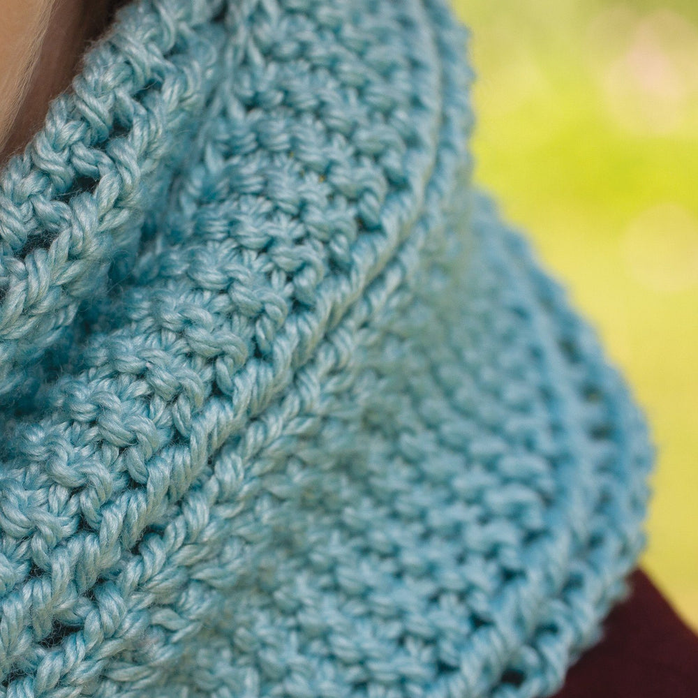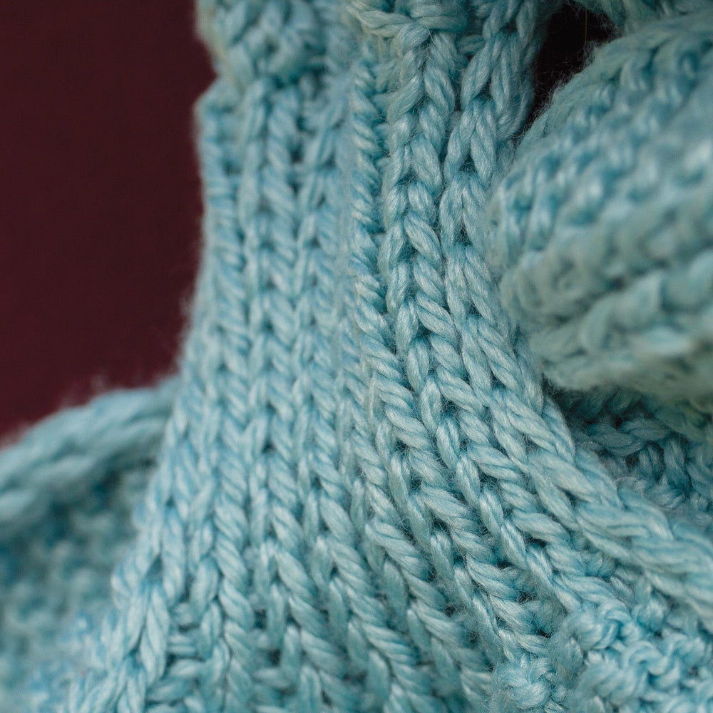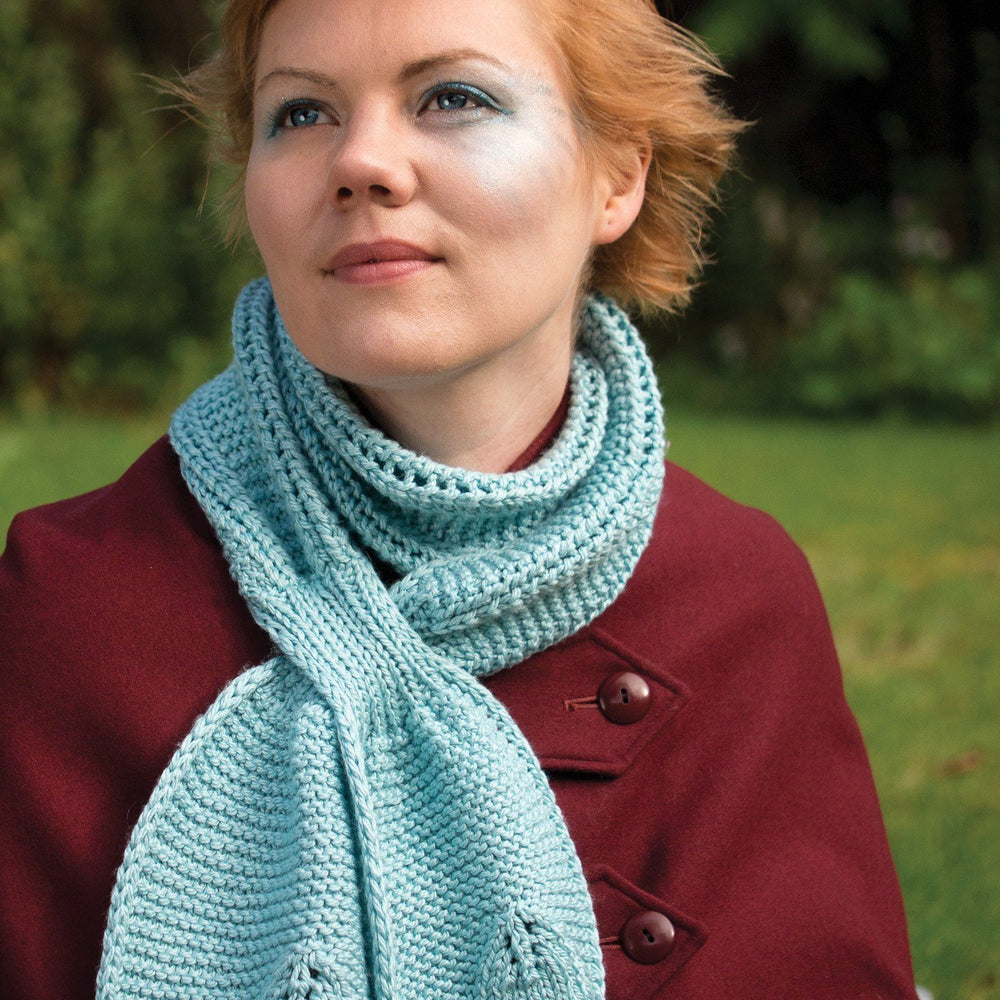 The scarf section features columns of simple lace that add interest and create structural folds, and the bow or leaf shape of the ends is echoed in the little leaf motifs. Both leaves are worked down from the ribbed section for perfect symmetry. A slipped stitch, I-cord like, selvedge neatens the edges.