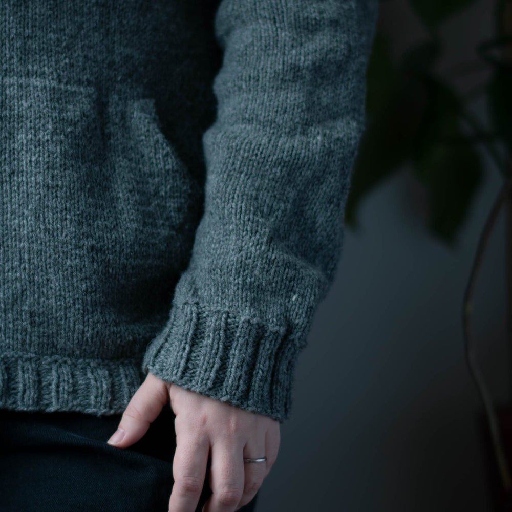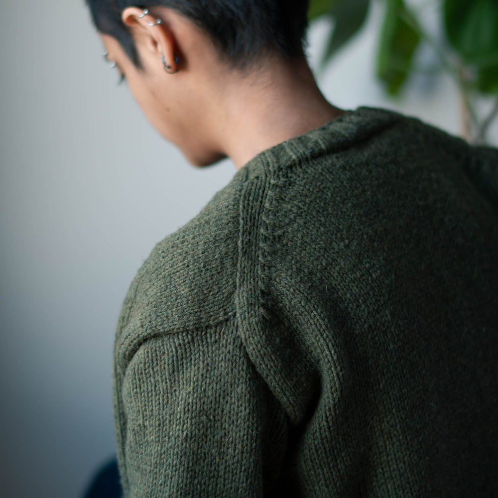 The back and front are worked separately from the bottom up, which gives structure and allows two layers to be worked on the fronts for the neatly constructed pockets. The wide, relaxed-fit shoulders use an extended version of English tailoring, with all of the shaping at the back. The style is somewhere between a set-in and dropped shoulder with very shallow sleeve caps. The sleeves are worked flat, from the top down, on stitches picked up around the armhole. The ribbed buttonband is worked by picking up stitches around the fronts.