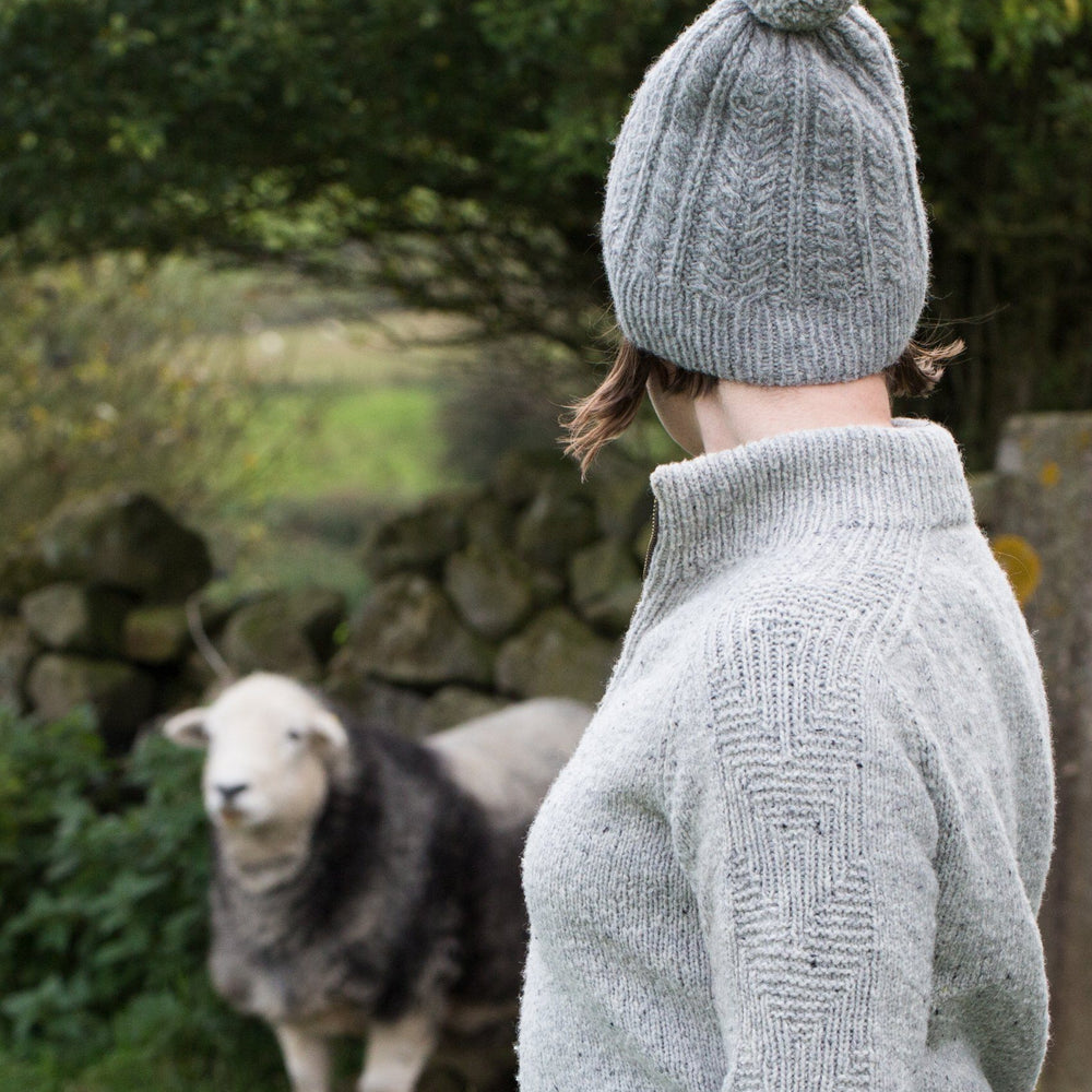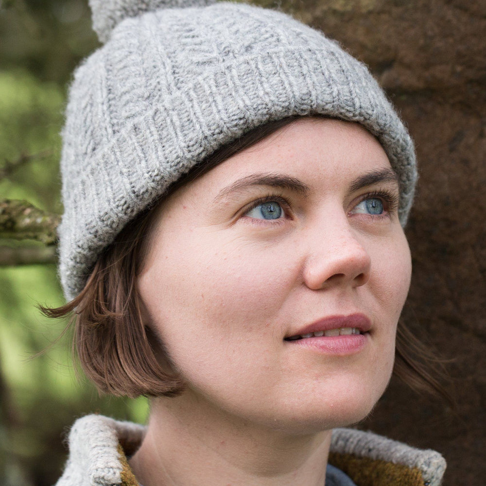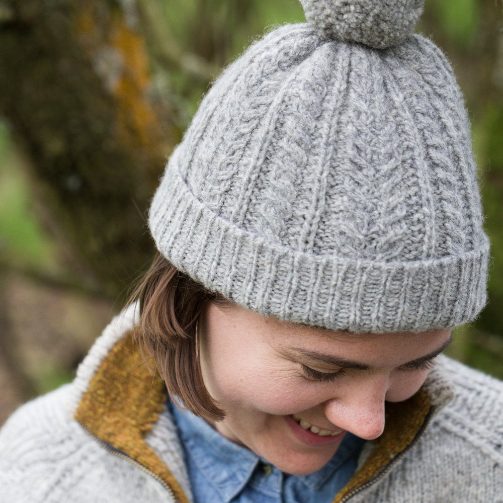 Decreases are worked into the stitch pattern at a relatively rapid rate for a slightly gathered effect at the crown that works equally well with or without the optional pom-pom.