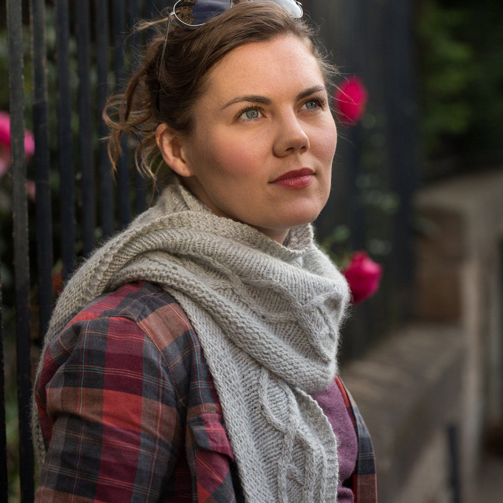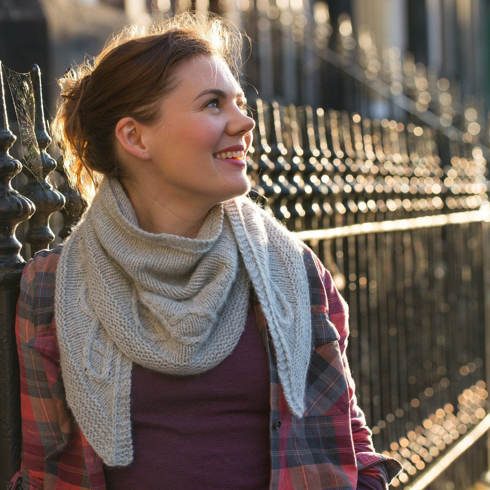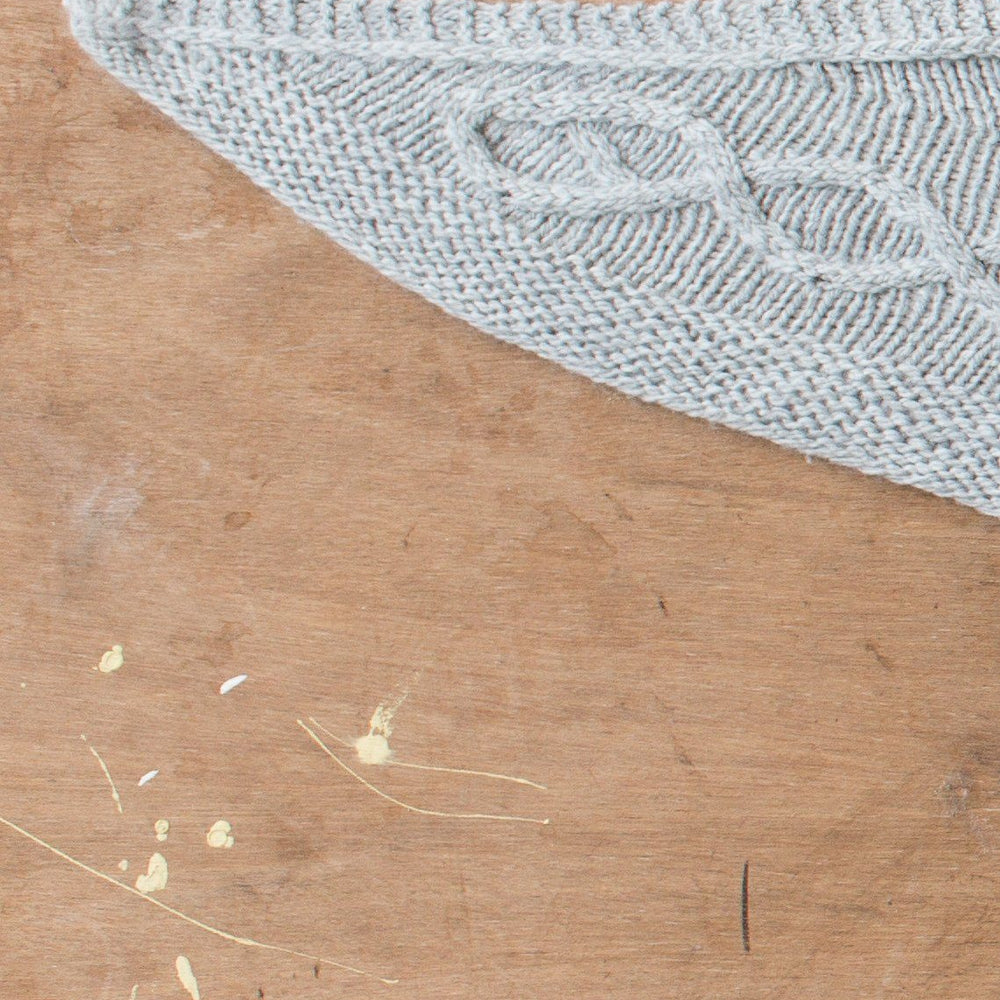 The shawl is worked bottom up with a garter stitch border followed by the cable panel. Short rows are then worked to shape the centre in a shallow curve. The straight top edge is finished by continuing the garter and slipped stitch edging set up at the beginning. Each side is worked into the centre, decreasing across the remaining live sts and the ends are kitchener stitched together for a neat finish at the centre top.