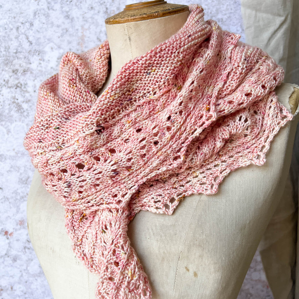 The lace and cable patterned edging is worked sideways first, and then stitches are picked up along one edge for the centre. Yarn overs worked along the edge make picking up stitches easy. The centre is worked in towards the centre top, and shaped with both decreases at the edges and short row wedges. The short rows create a very shallow crescent shape that's easy to wear as a scarf or wrap.