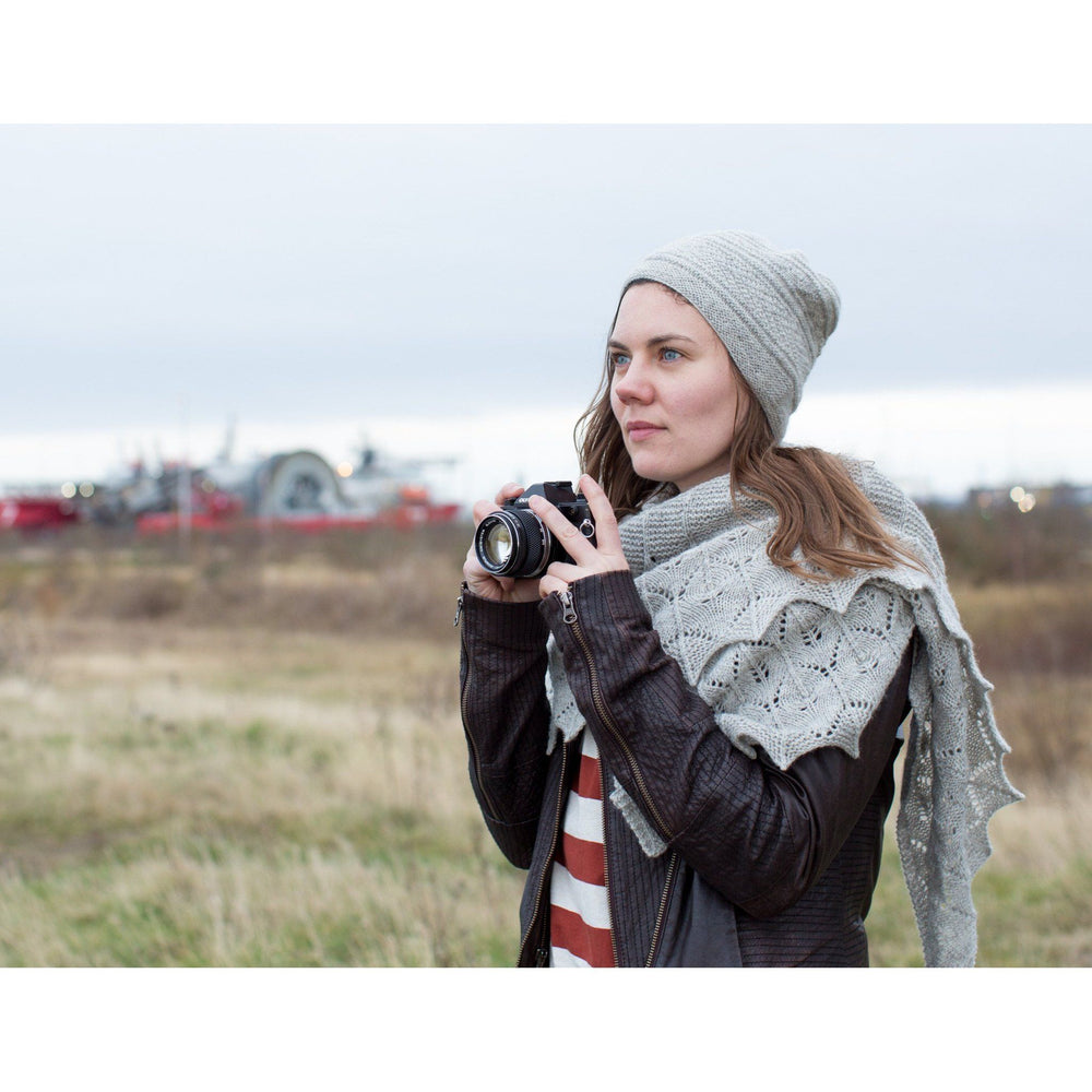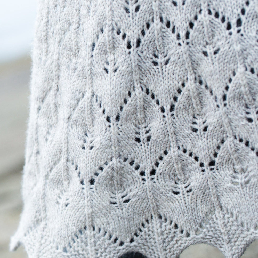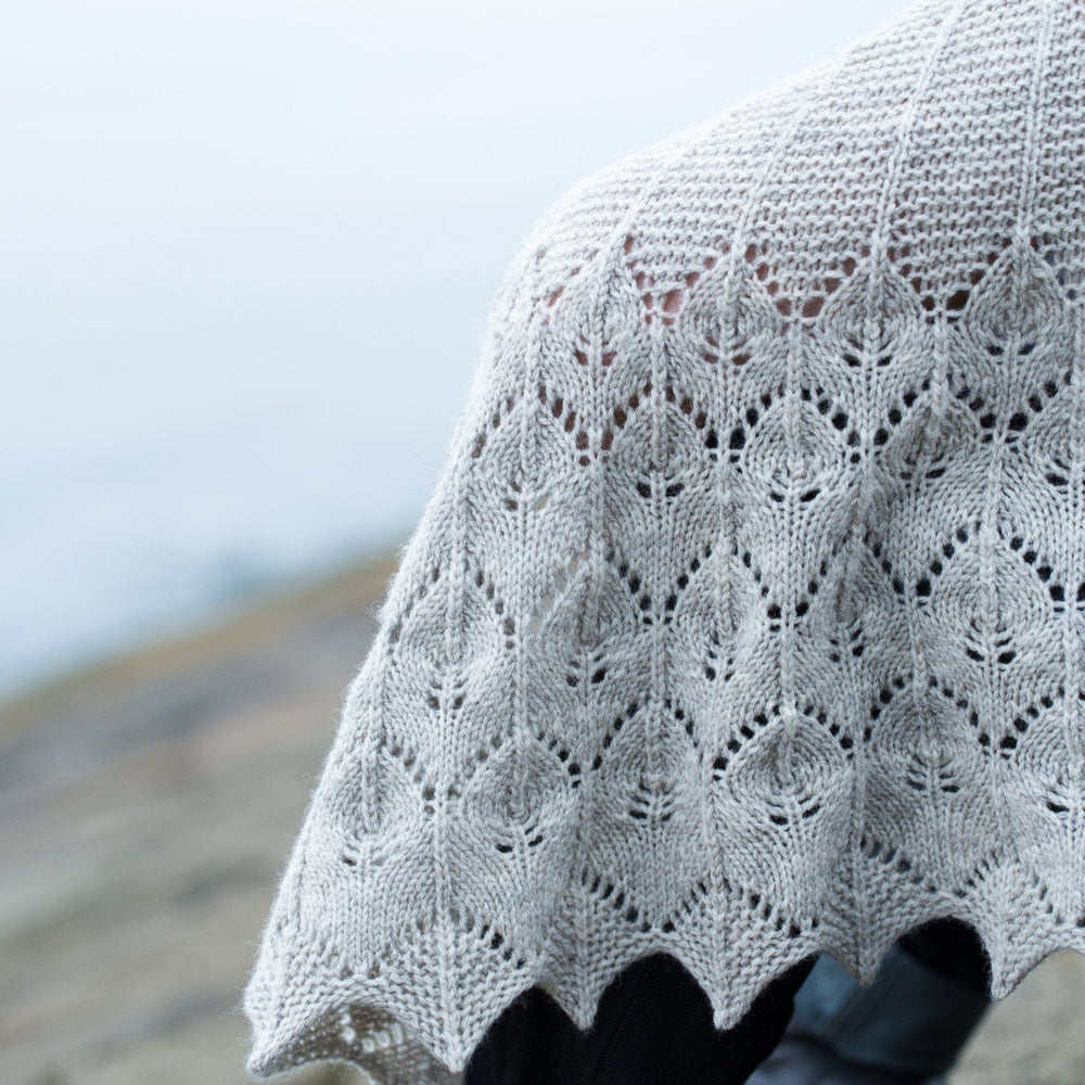 Worked from the bottom up in a lace pattern that gradually decreases in scale and forms sharp points along the edges. The strong verticals formed by the centred double decreases in the lace pattern transition into ribs on a garter stitch ground. Concentric decrease rows gather these spokes together until there are no stitches left between them. The centre is worked in garter stitch with the last few stitches grafted together for a neat finish.
