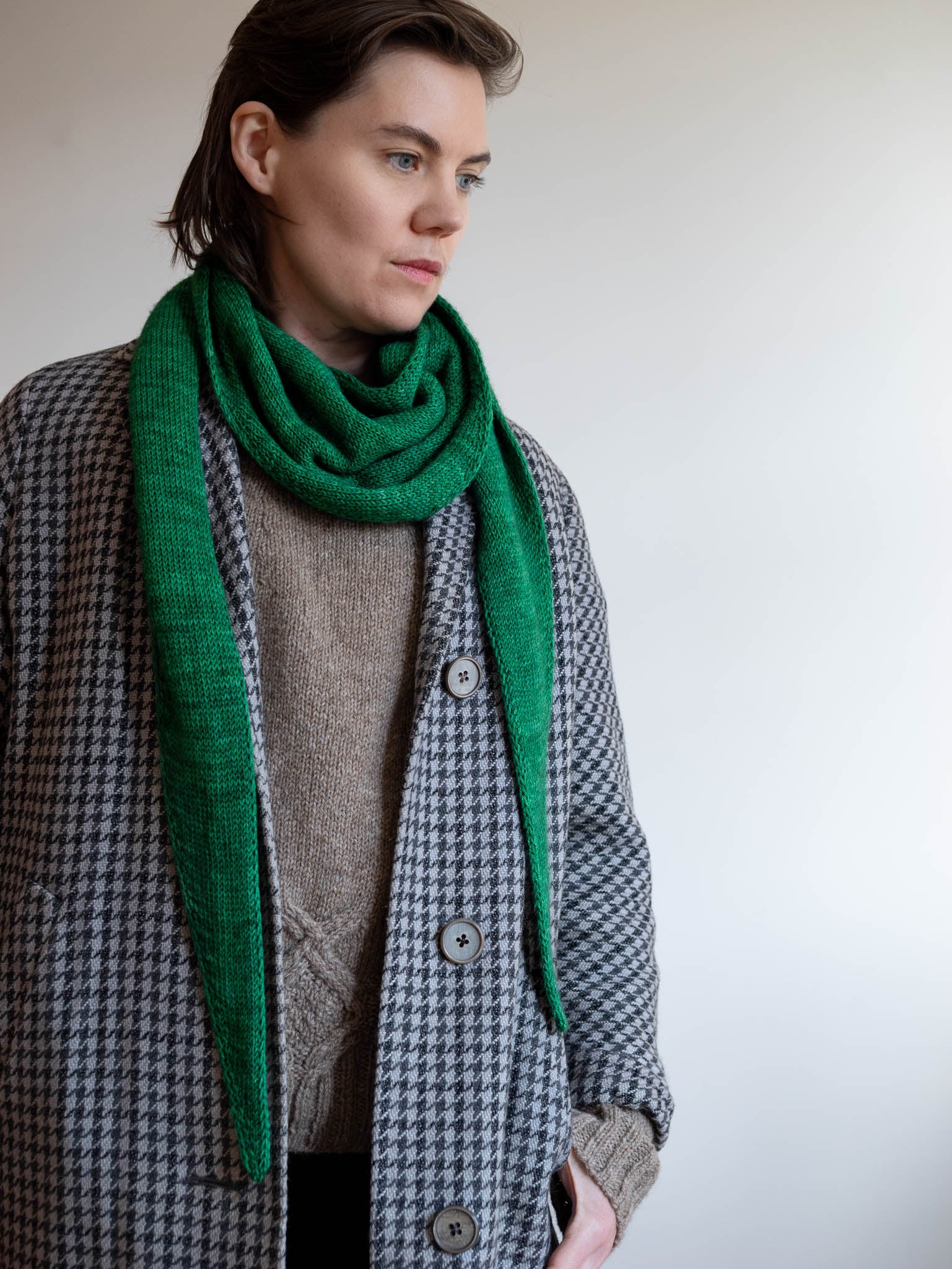 A simple, elegant triangular swatchless scarf knit in the round in clean stockinette.