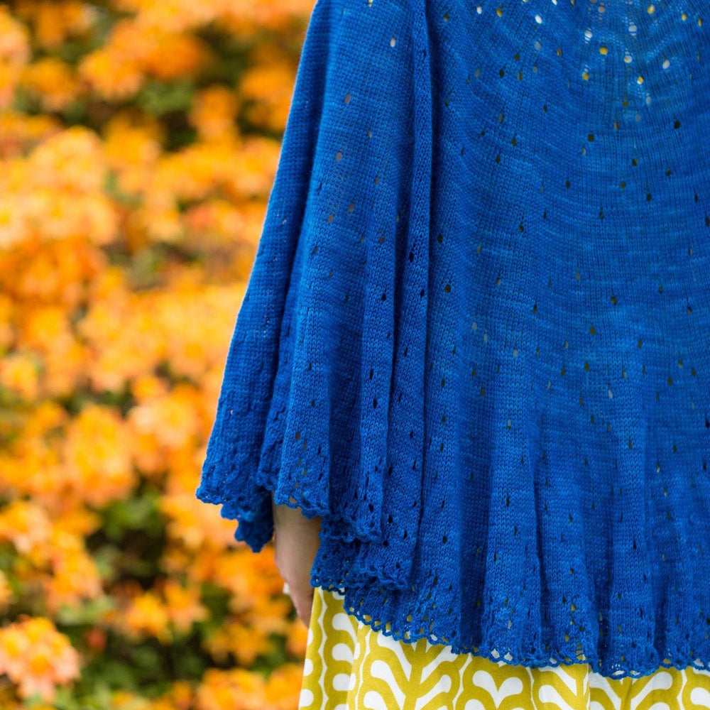 Worked from the top down the shaping is created with randomly placed yarn overs which get gradually further apart. In the final section more yarn overs with corresponding decreases are worked to create a more open pattern. The bottom edge is finished with a delicate but simple crochet loop bind-off . If you’ve never crocheted before just a little practice making a chain will equip you with all the skills necessary.