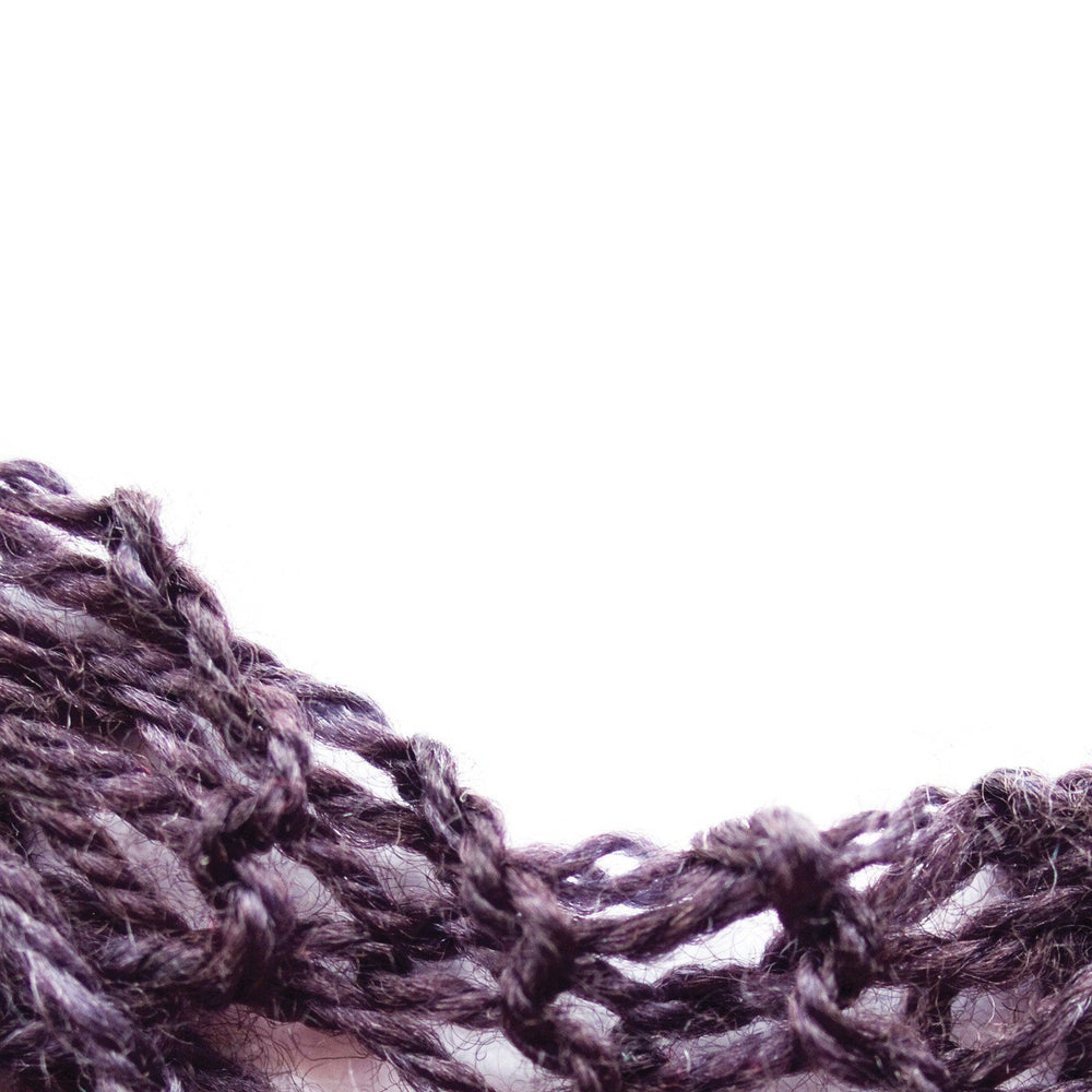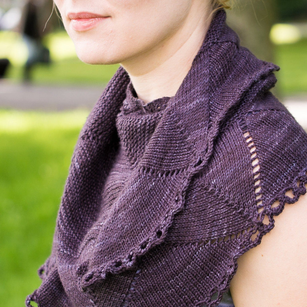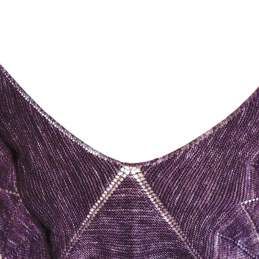 Working two columns of paired yarn over increases that radiate from the centre neck cast on creates a curved shape that drapes perfectly around your shoulders. Increasing at the edges on both right and wrong side rows results in long points that make Damson ideal to wear as a scarf. Large scale lace creates a dramatic scalloped edge, finished with a deceptively simple looped edging.