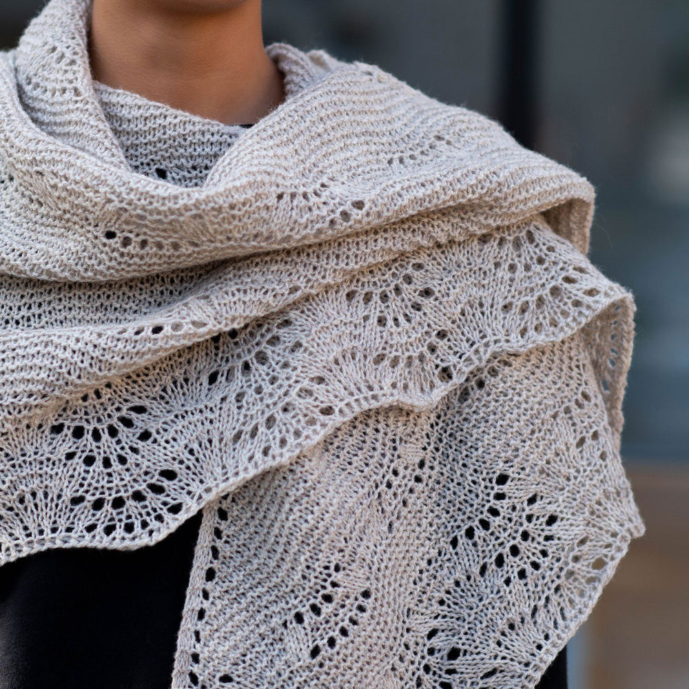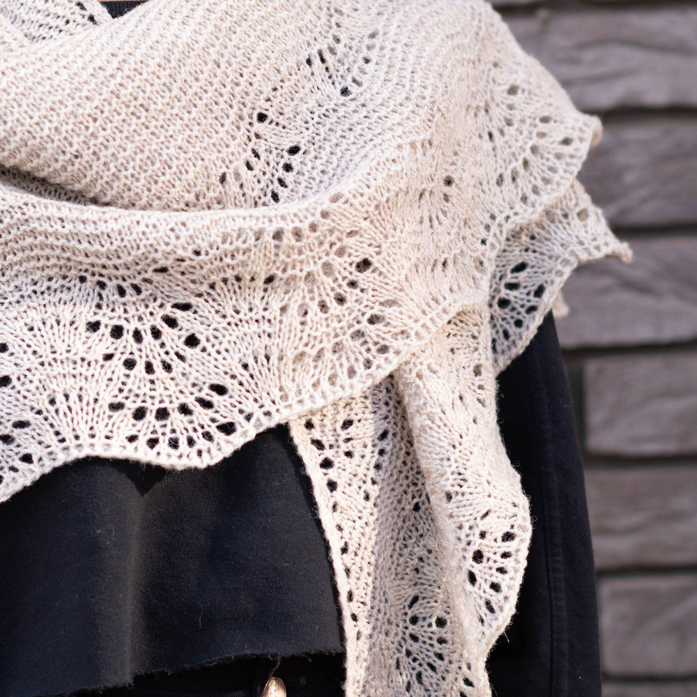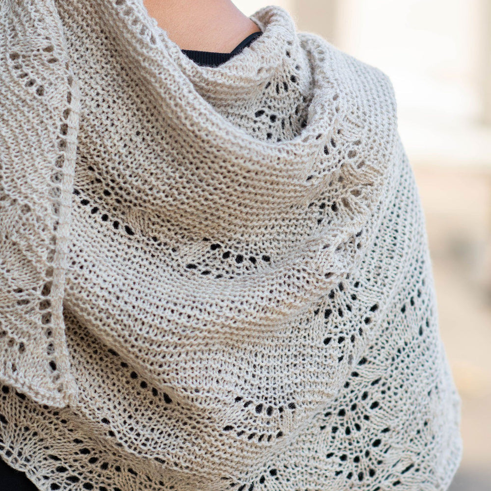 Halimede is worked from the top down, beginning with a garter tab cast on. Stitches are increased at the ends of every row for a shallow easy-to-wear shape. The usual centre spine of a triangular shawl is replaced with a feather and fan panel, increasing several stitches every few rows. This design detail also rounds the shape of the shawl. The vertical panel of feather and fan combines with horizontal bands of the same stitch pattern. A wider border of the pattern completes the shawl. This variant of feather and fan combines garter and stockinette columns for a slightly different look than usual that highlights the shifting arrangement of the stitches.