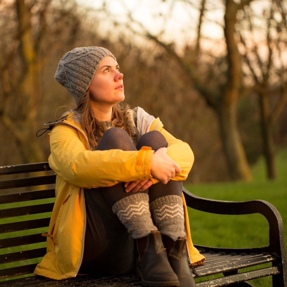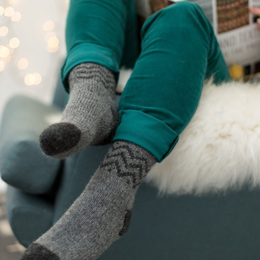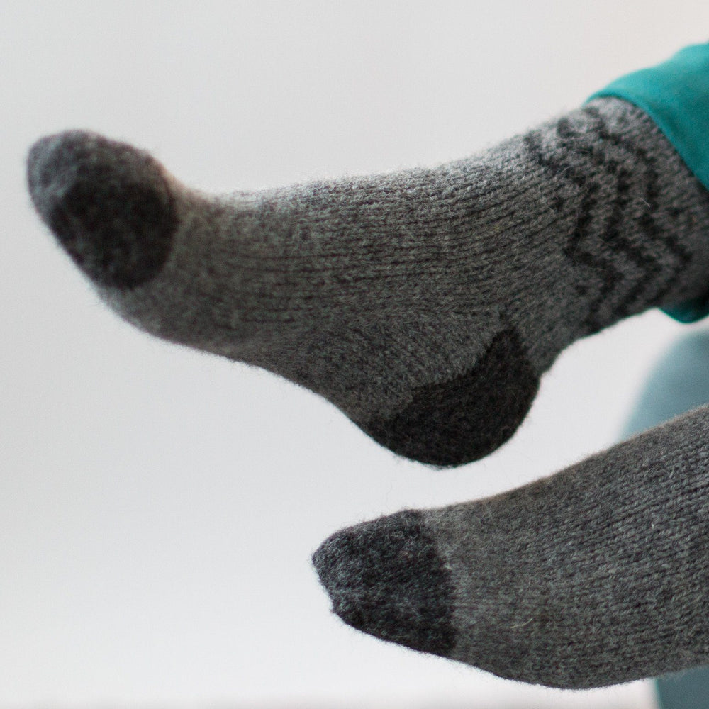 I've spent my whole life living in old buildings with draughty wooden floors — there can never be enough thick woolly socks in the wintertime. Worked in a sturdy wool nylon blend in an unusually heavy weight for a sock yarn Hugni will keep your toes warm and should hold up well to be even if you spend as much time sliding down the hallway as I did as a small child.