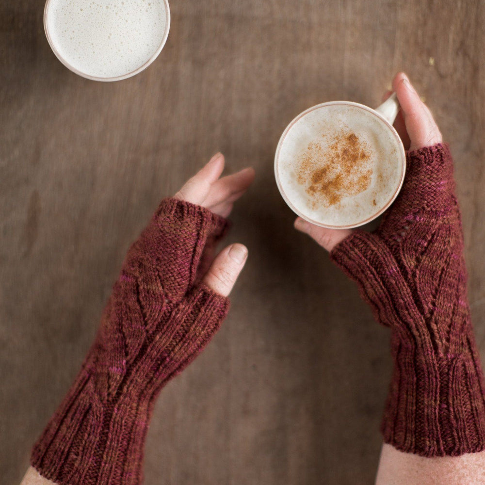 The ribbing is gradually incorporated into a simple lace and texture stitch pattern that deconstructs and reassembles traditional fern lace patterns. The mitts are long enough to cover the first knuckle while allowing full finger motion and are completed with a few rounds of two by two rib.