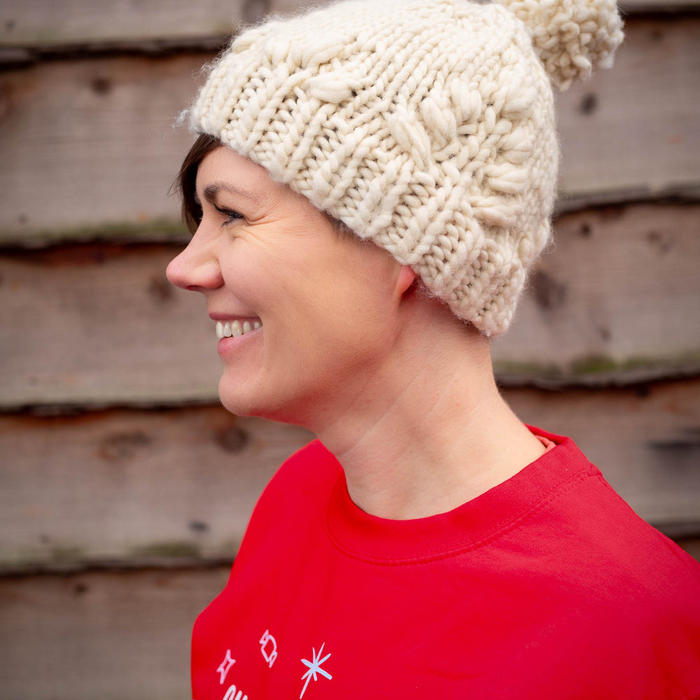This fun project combines cluster stitches and cables to create embossed trees on the surface of the fabric. The accompanying step-by-step tutorial video will guide you through each unusual stitch. Licht knits up quickly in bulky yarn – almost instant gratification whether you’re making a last minute gift or taking a moment to knit for yourself. Plus it’s just the right length for cosying up with a holiday movie or two. And of course it wouldn’t be complete without a cute Pom Pom!