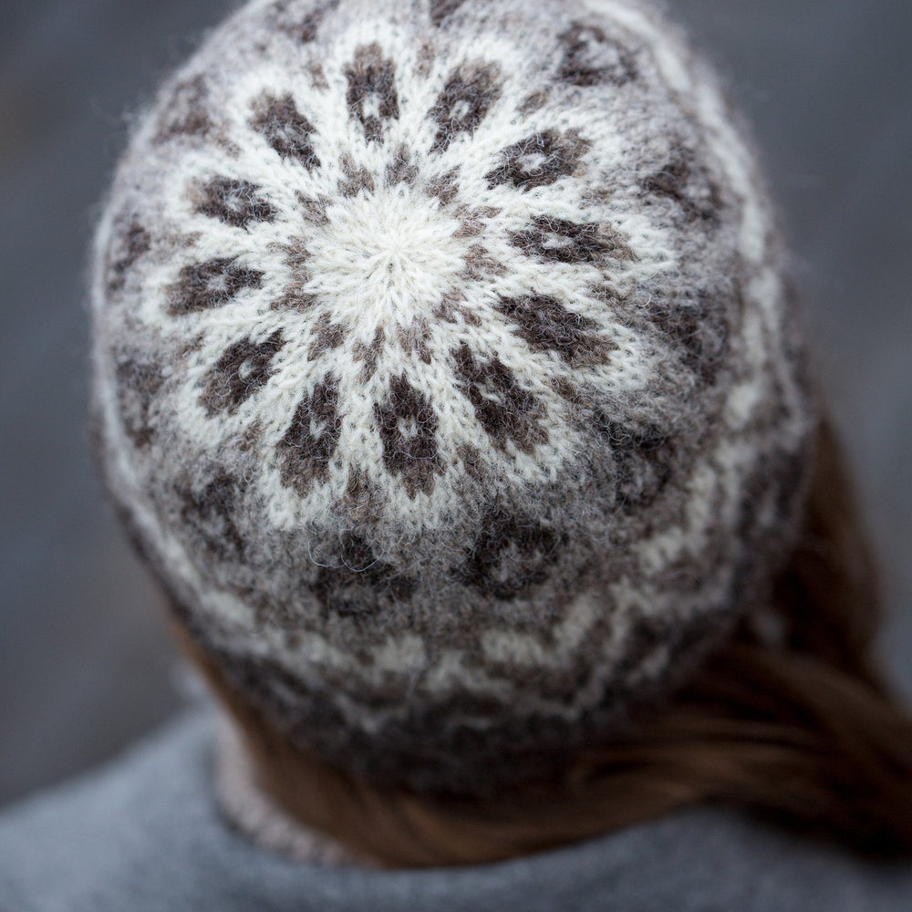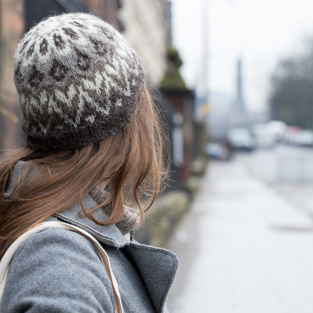 The hat is worked from the bottom up with decreases incorporated into the colourwork pattern, as it is on those yokes, creating a particularly appealing crown pattern. There are a few rounds using three colours, which can be tricky, but take them slowly and I think you’ll find the resulting blending of shades is worth it.