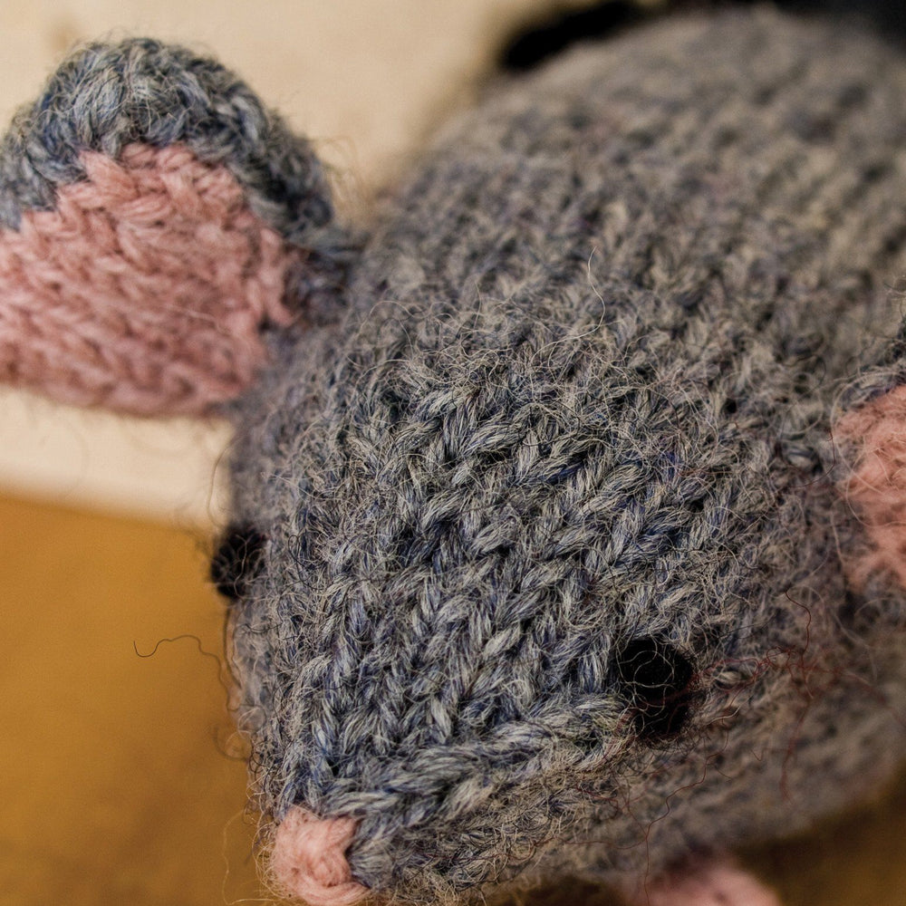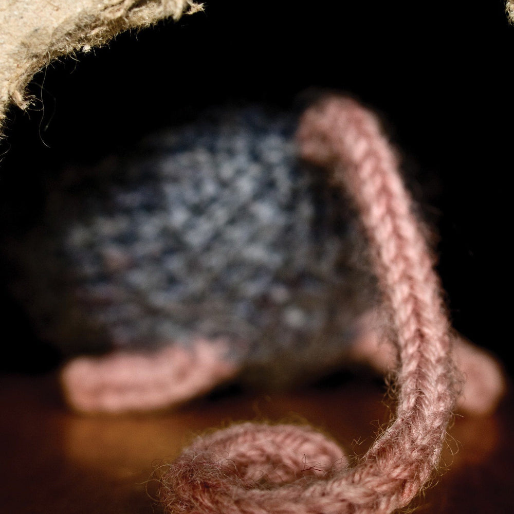Mousie’s knit almost entirely in the round with minimal seaming. The body is worked in one piece, beginning with the charming I-cord tail and ending with the tip of his nose. Then sts are picked up for the simple I-cord limbs and big, alert ears.