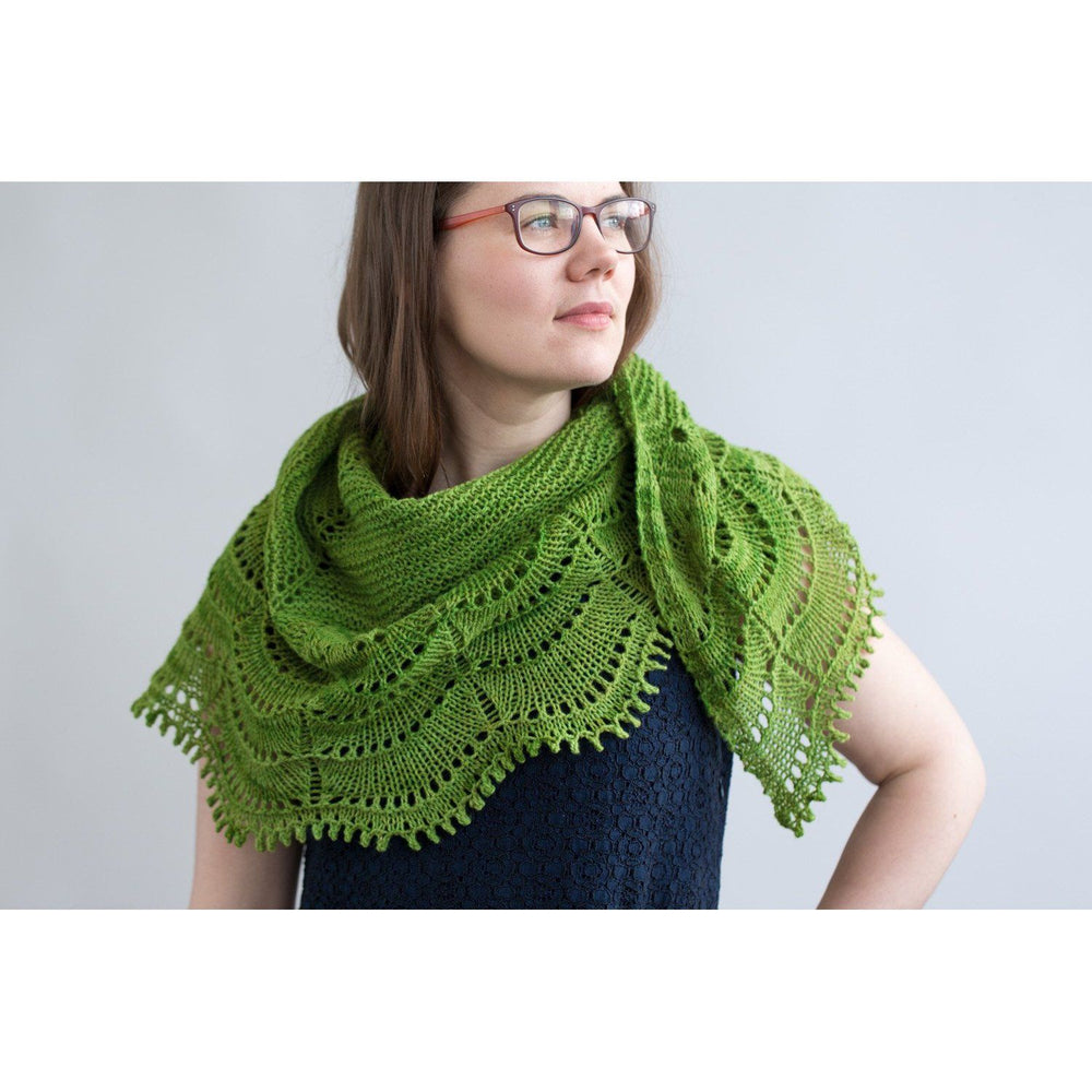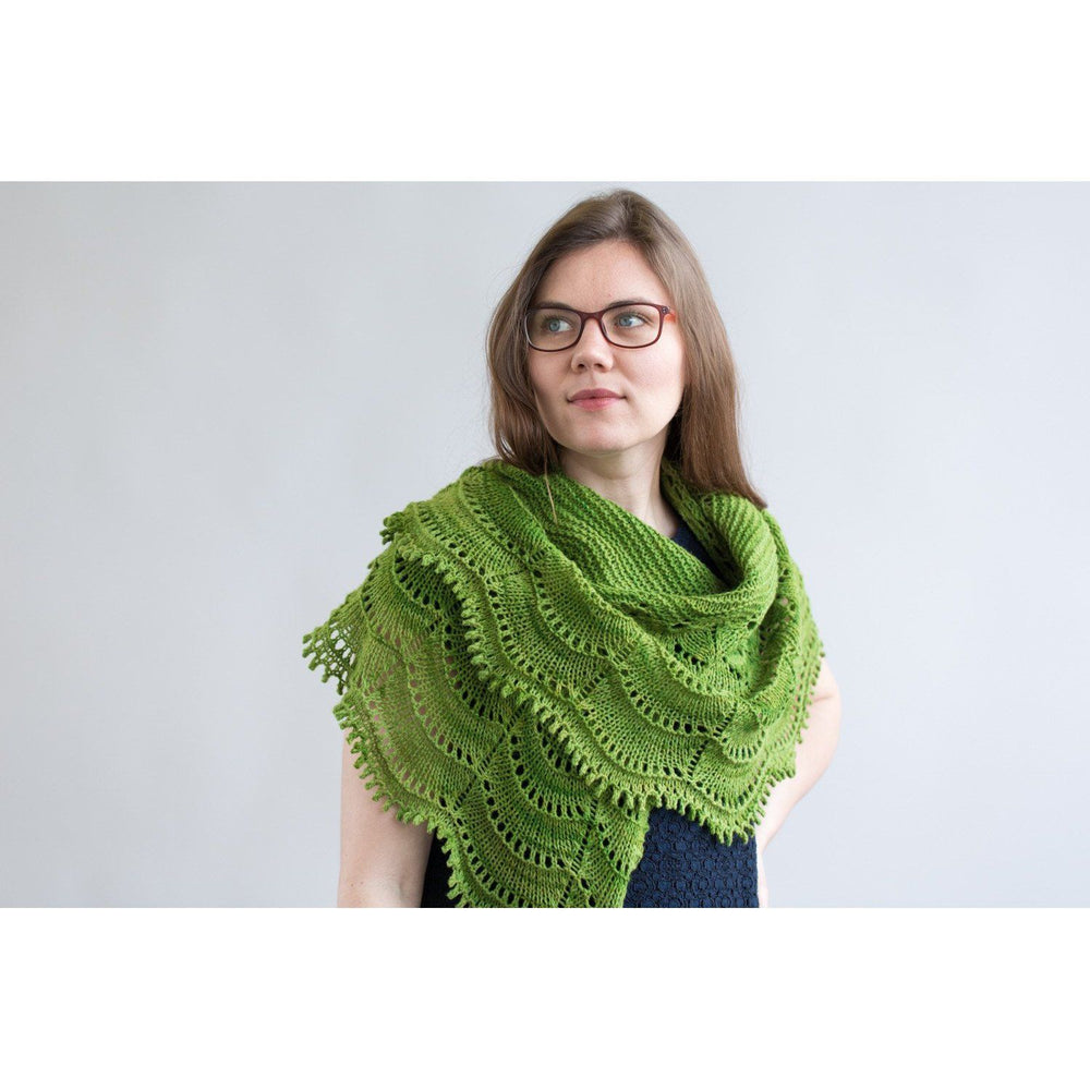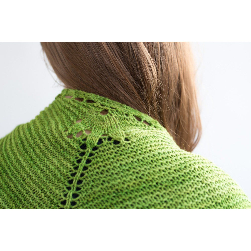 It begins with a leaf (or petal) motif at the center top, then moves into a wide garter stitch triangle shaped with a yarn over spine and large yarn over holes at the edges. The deep edging is worked as a continuation of this triangle, but the increases are moved to within the stitch patterns to create a gentle curve. The edging begins with a larger version of the petal motif followed by a variation on traditional feather and fan. The shawl is completed with a picot bind off. The large holes, organic curves and sharp points were inspired by the tunneled rock formations of the sea stack Stac Shoaigh while the garter stitch and feather and fan is reminiscent of everyday ‘Hap’ shawls from the Shetland isles.