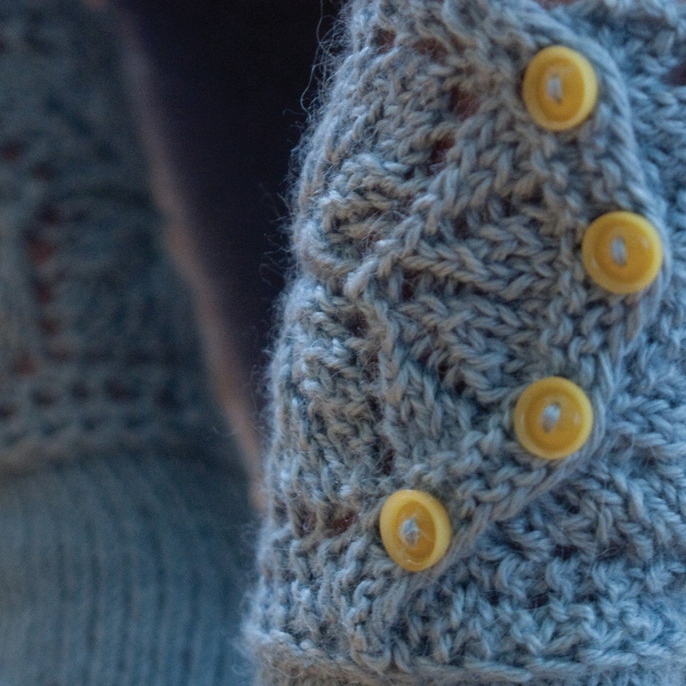 The cuff, featuring a drooping elm leaf pattern, is worked back and forth and then stitches are picked up along one edge and the rest of the mitt is knit in the round downwards. Thumb increases and a single leaf motif on the back of the hand echo the lace cuff.