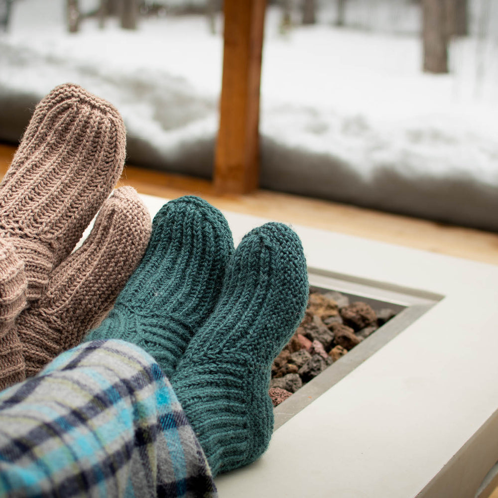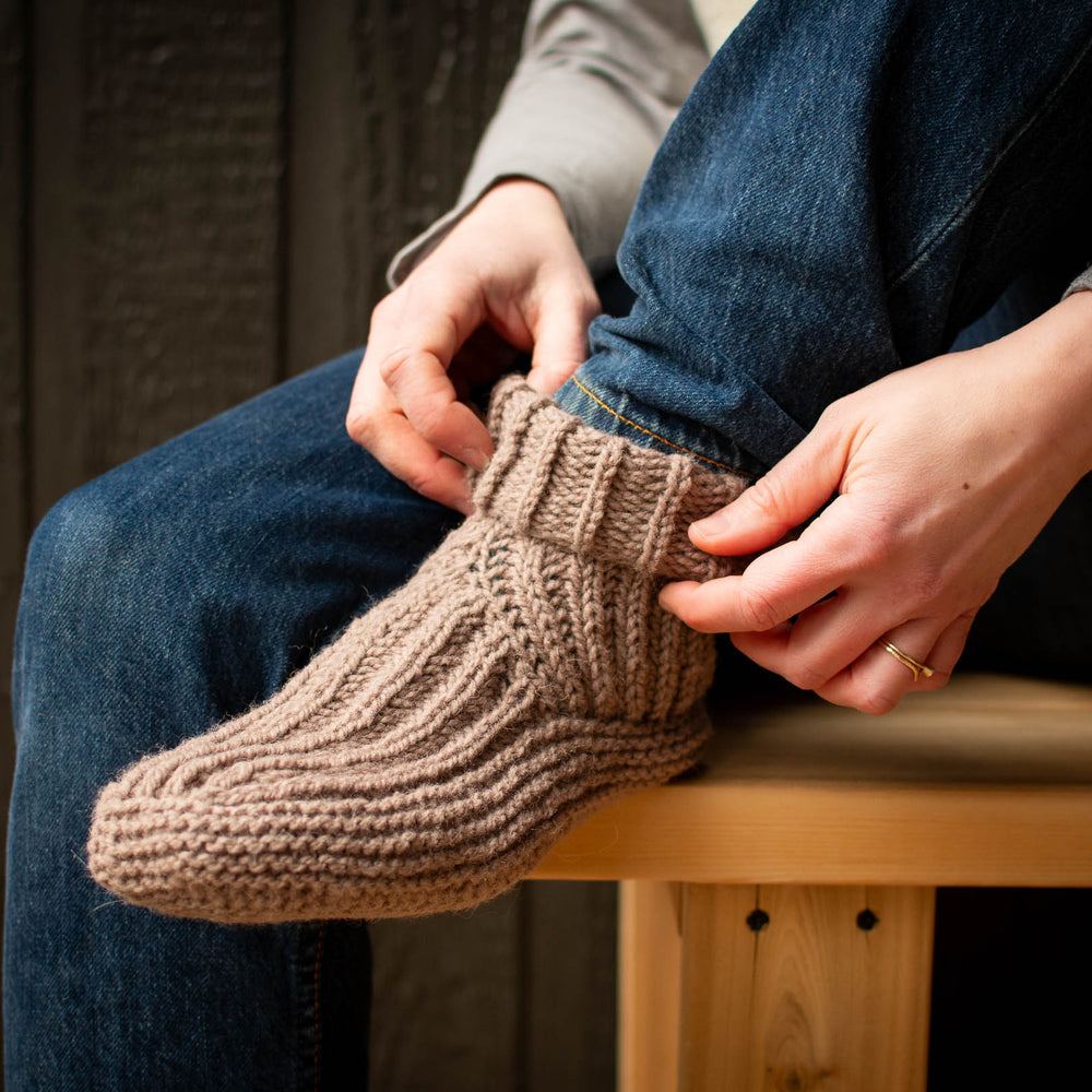 Construction begins with the cuffs, which can be worked to ankle length or long enough to fold over. A single column of increases beautifully curves around the foot, highlighted by the architectural lines of brioche stitch. Short rows are used to lengthen the top of the foot, and the soles are worked flat in garter stitch, from toe to heel, decreasing onto the live upper stitches as you go. The only finishing required is grafting a few stitches together at the back of the heel.