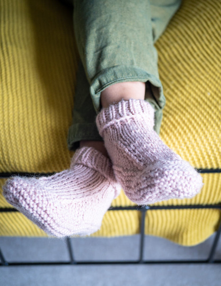 These slippers were designed with the highest levels of cosiness in mind! Construction begins from the centre of the sole, which is worked in the round in garter stitch to get that extra squishy feel and shaped with short rows for a close, anatomical fit. Working out from this point you then create a ribbed, deeply folded cuff which will keep the slippers secure and ensure that every toe is happy and warm!