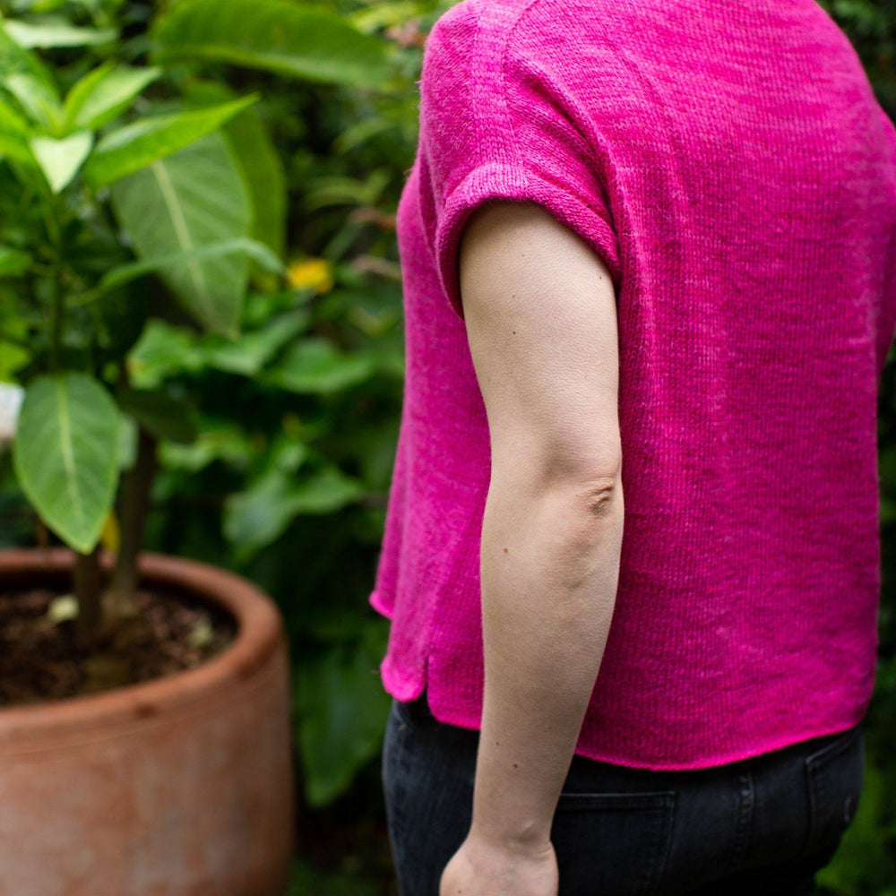 Worked top down with a fun and easy construction, Inverleith is specifically designed to have similar proportions across the size range; with two options for cup sizing built in it’s a boxy shape that works with whatever curves you have. The shoulders are worked in one piece and then divided for front and back. The front and back are each worked flat and then joined in the round at the underarm. Folded cuffs are worked by picking up stitches around the armhole and the neck is finished with a simple edging worked by picking up stitches, knitting one round then binding off. There is very minimal finishing.
