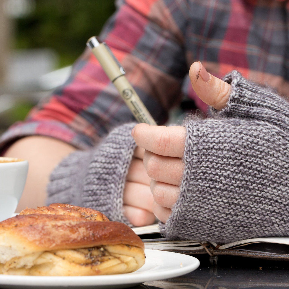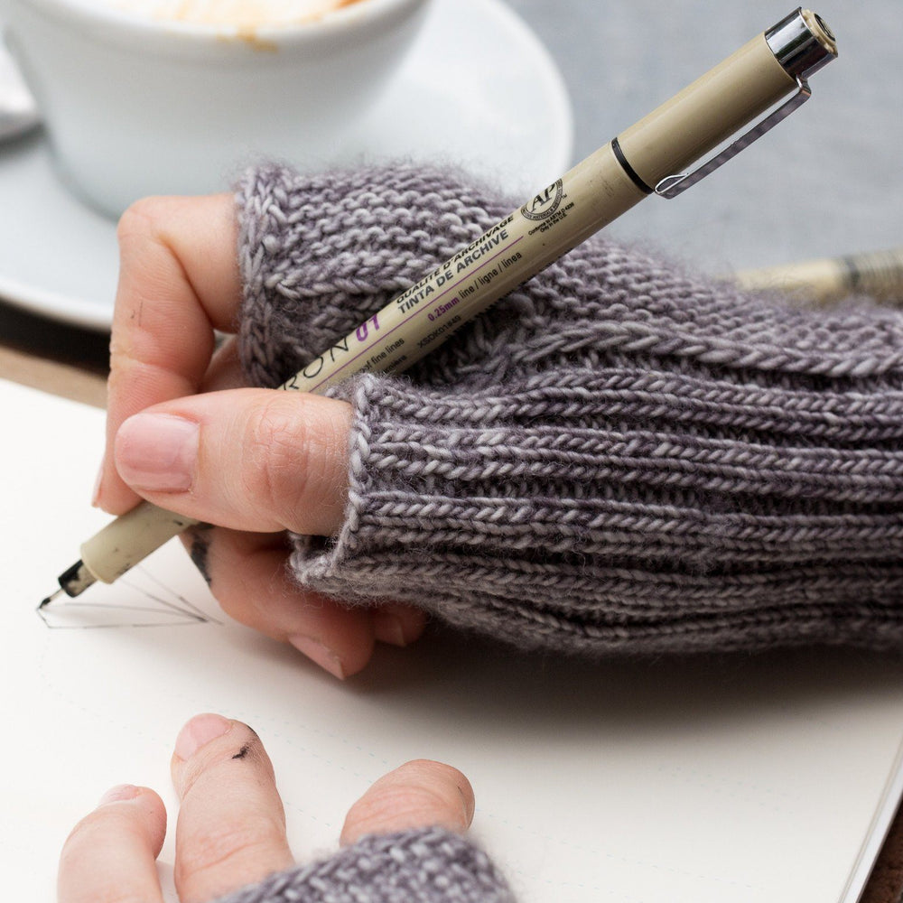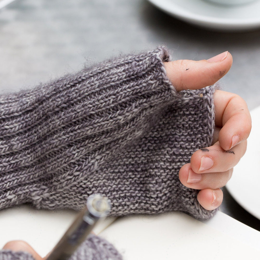 The mitts begin at the cuff which is worked in the round using the magic loop technique. A provisional cast on is used to add stitches for the hand which is worked back and forth in garter stitch with an I-cord edge and decreased across the live cuff stitches. Instead of a traditional gusset, shaping for the thumb is added by working across the hand and remaining cuff stitches, decreasing where they join to create a triangle of garter stitch across the palm. The remaining garter stitches are joined to the provisional cast on stitches above the thumb with a three needle bind off and triangular gusset that is worked downwards to join the remaining thumb stitches. The thumbs are then worked in the round. The only cast-on and bound-off edges are at the base of the cuff and the top of the thumb and the only finishing required before gifting is weaving in the ends and blocking.