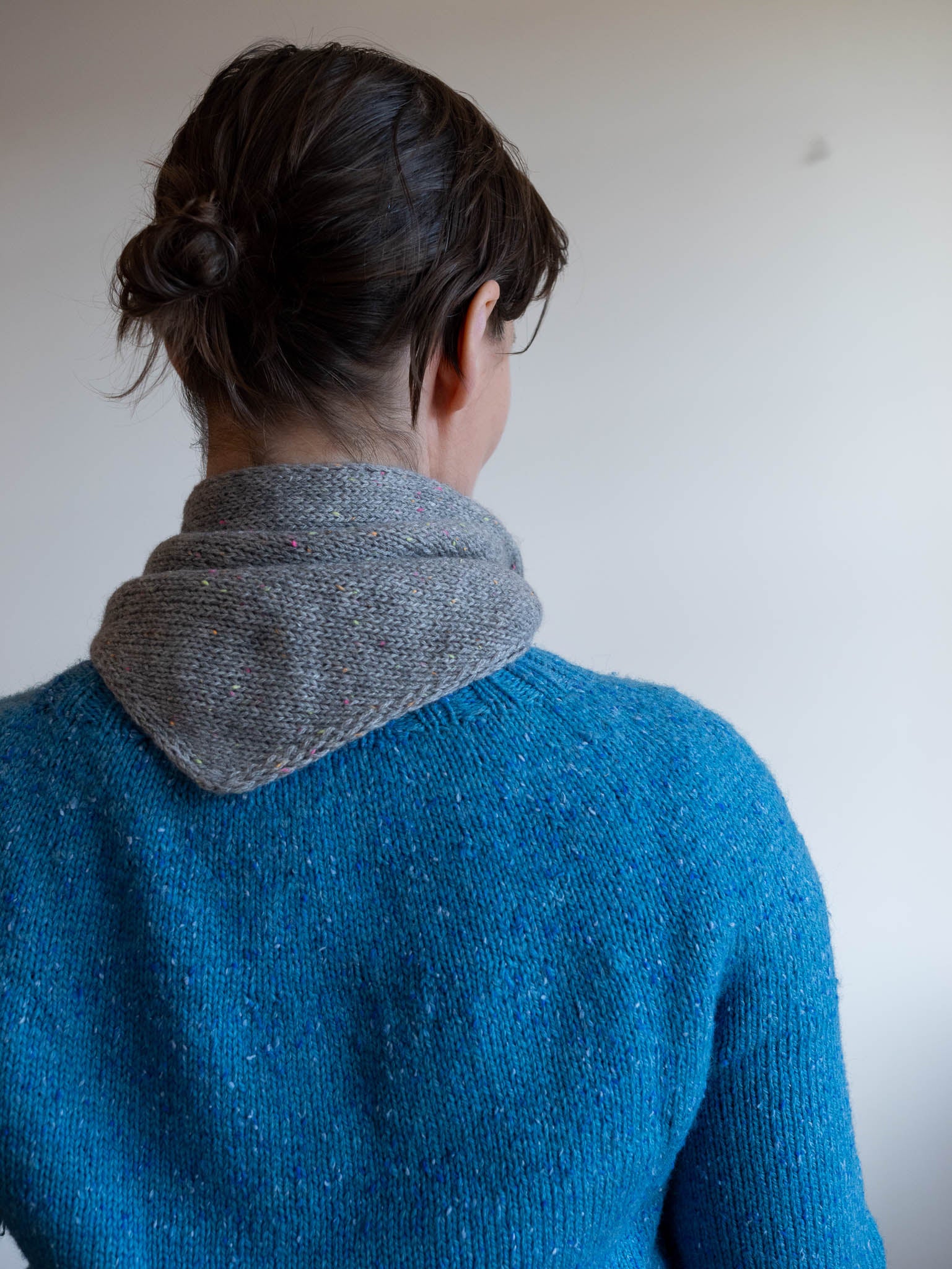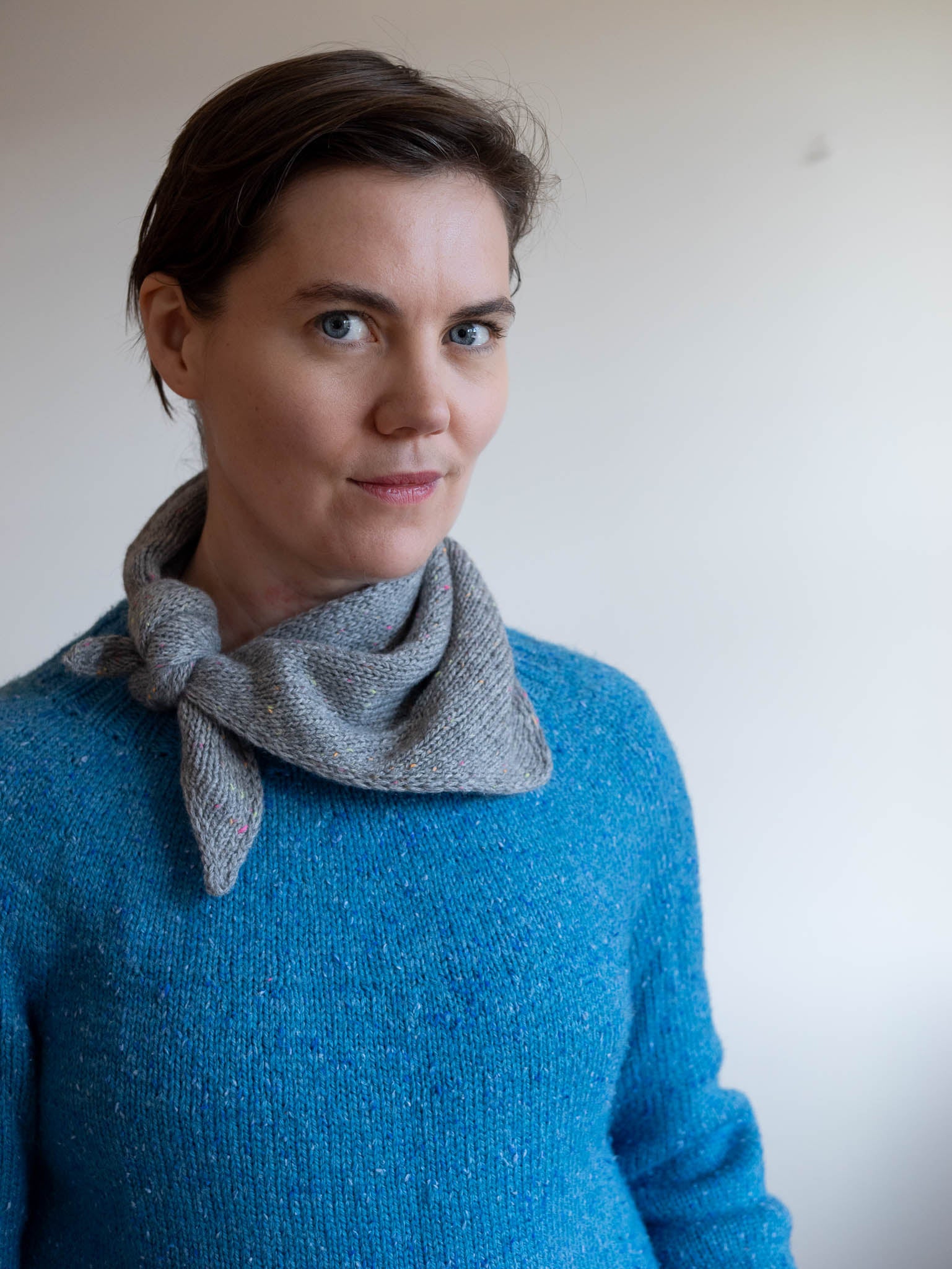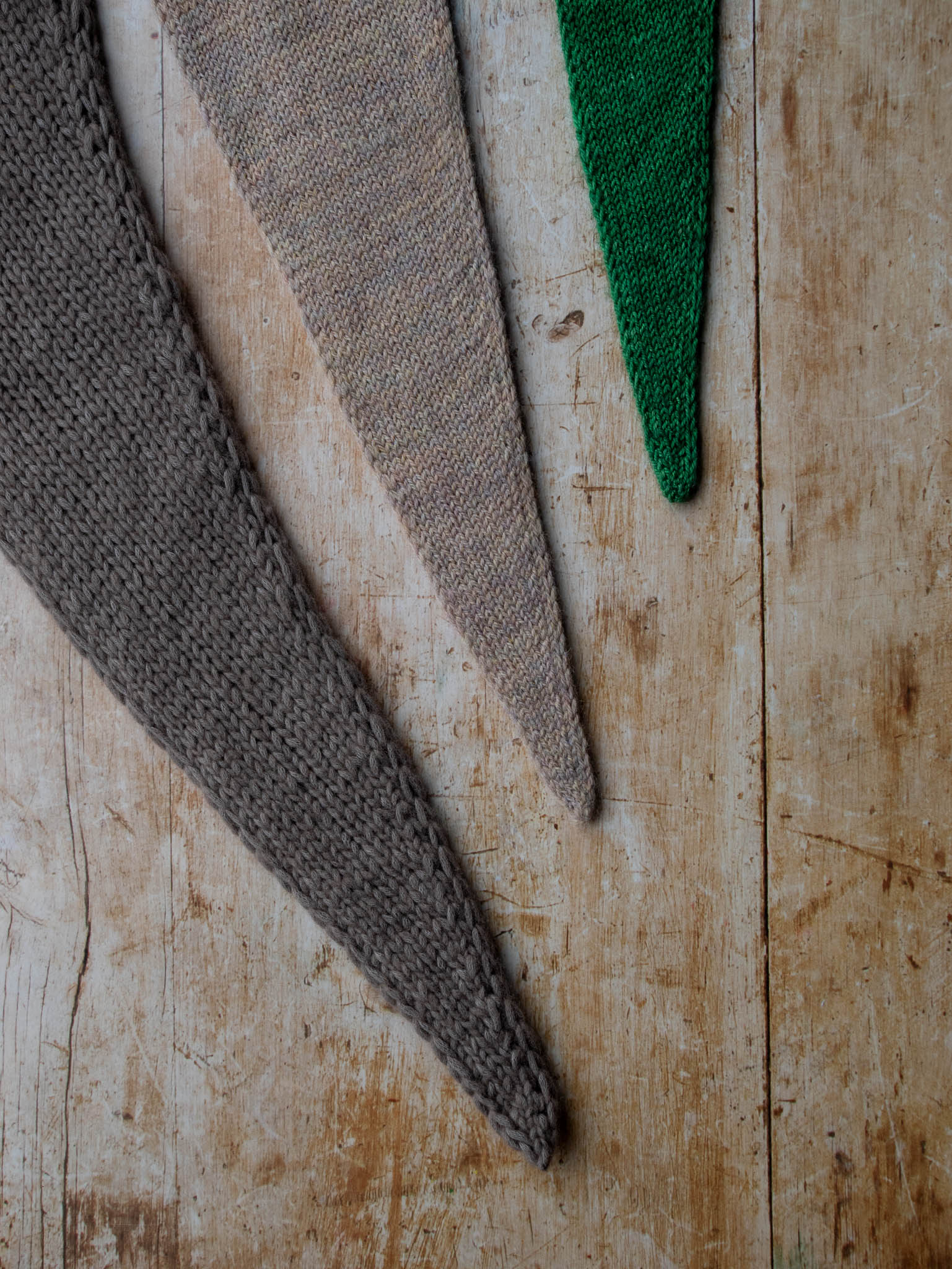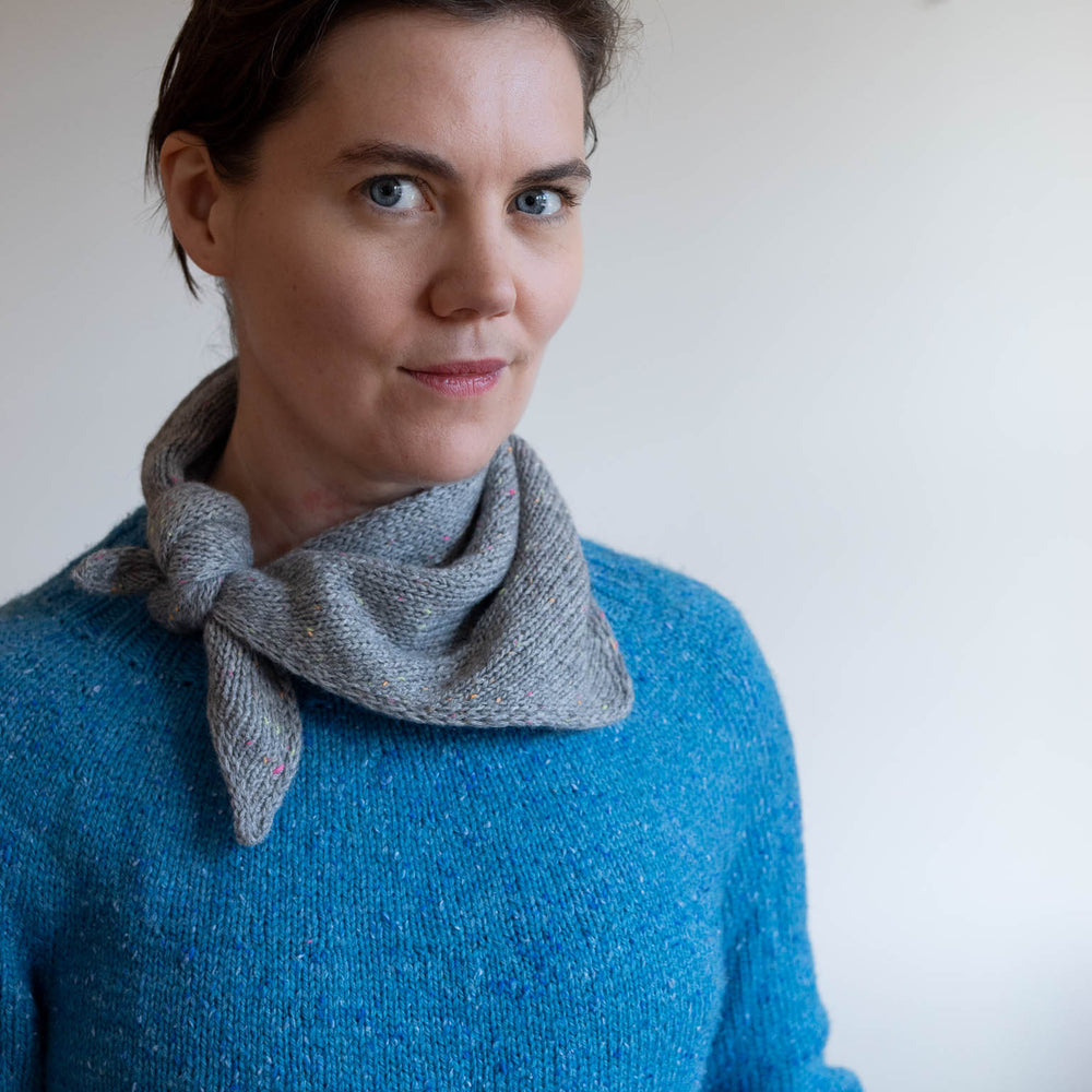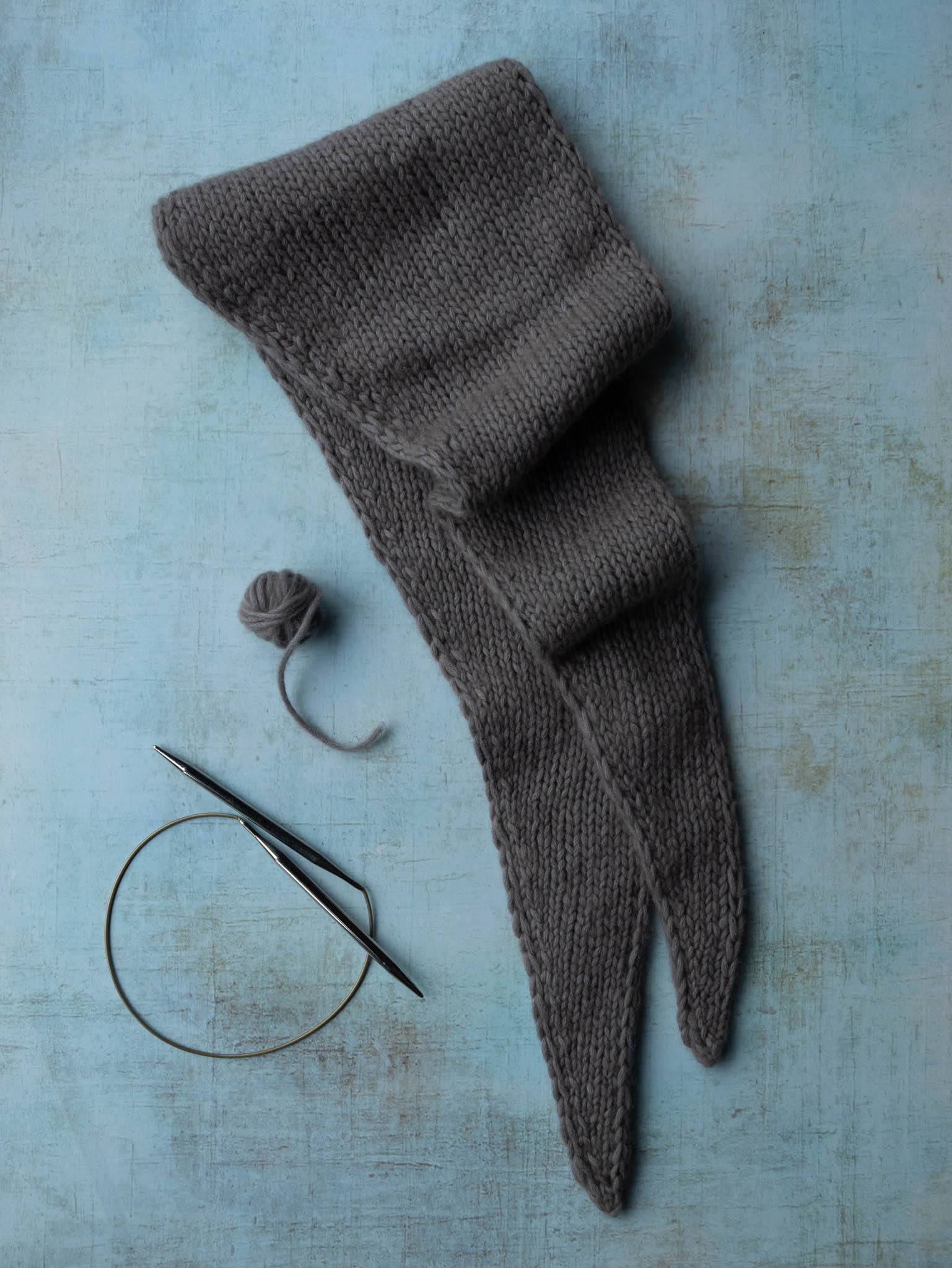 A simple, elegant triangular scarf knit in the round in clean stockinette.