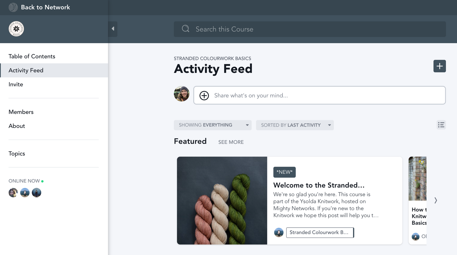 The course is hosted on the Knitwork. You're welcome to participate in the discussion group as much, or as little, as feels right to you. Whatever your skill level, your contributions are welcome, and if you have a question there's almost certainly someone else wondering the same thing who is too shy to ask.